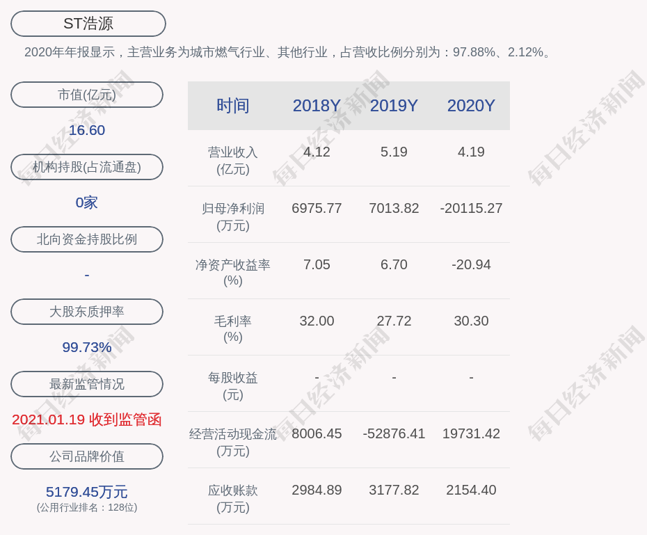 2020年年报显示,ST浩源的主营业务为城市燃气行业、其他行业,占营收比例分别为:97.88%、2.12%。