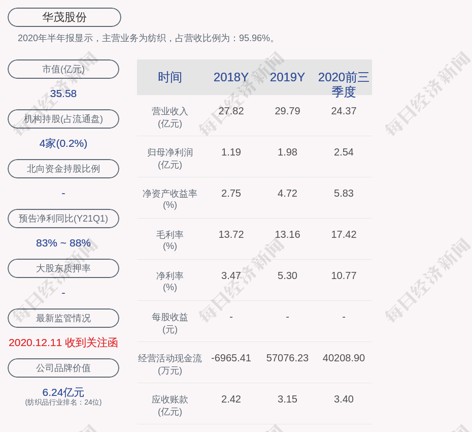 2020年半年报显示,华茂股份的主营业务为纺织,占营收比例为:95.96%。