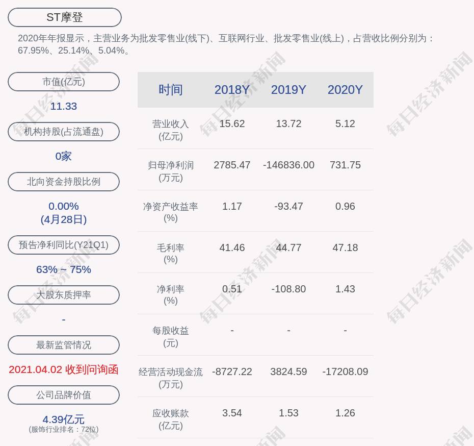 2020年年报显示,ST摩登的主营业务为批发零售业(线下)、互联网行业、批发零售业(线上),占营收比例分别为:67.95%、25.14%、5.04%。