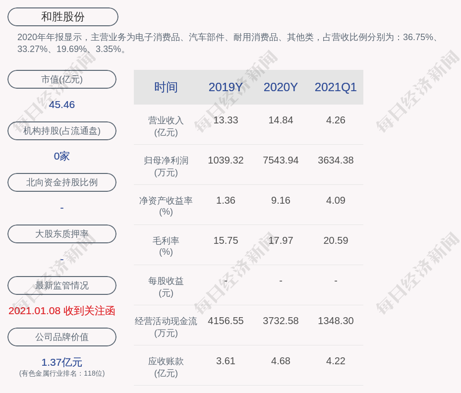 2020年年报显示,和胜股份的主营业务为电子消费品、汽车部件、耐用消费品、其他类,占营收比例分别为:36.75%、33.27%、19.69%、3.35%。