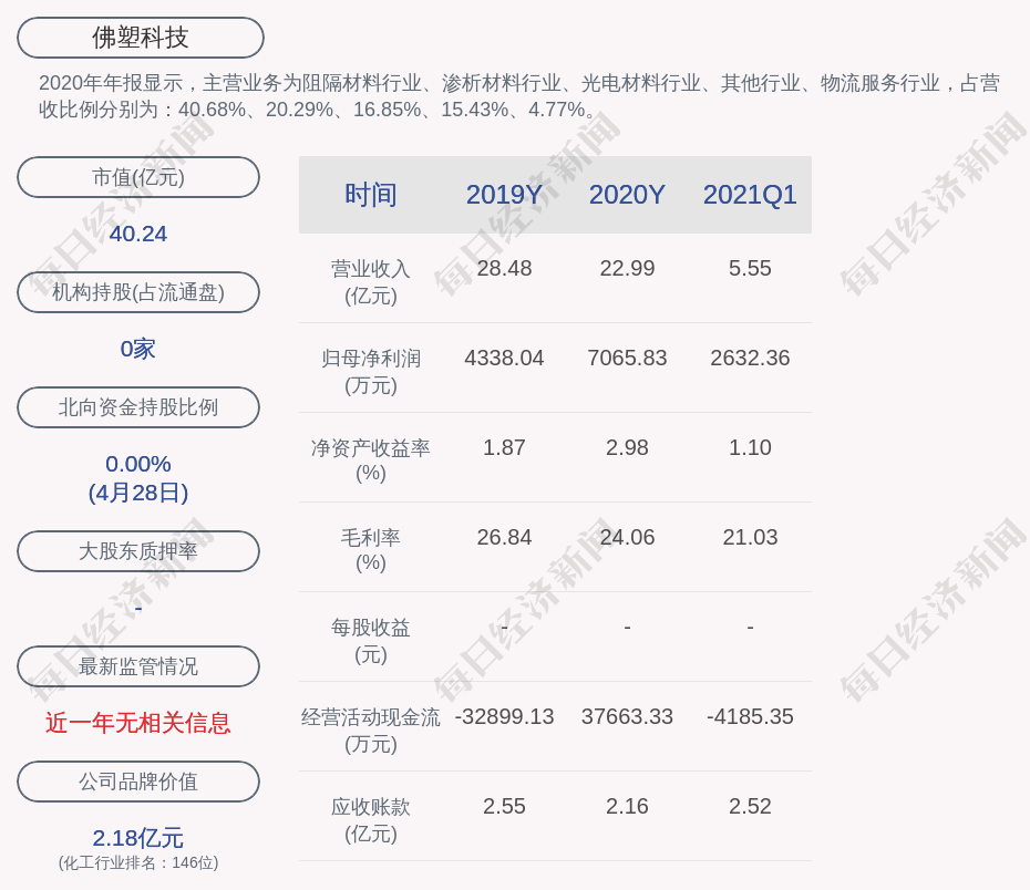 2020年年报显示,佛塑科技的主营业务为阻隔材料行业、渗析材料行业、光电材料行业、其他行业、物流服务行业,占营收比例分别为:40.68%、20.29%、16.85%、15.43%、4.77%。