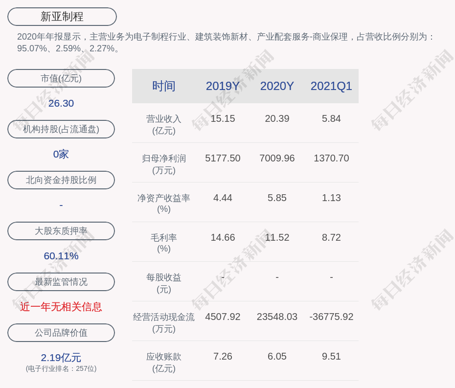 2020年年报显示,新亚制程的主营业务为电子制程行业、建筑装饰新材、产业配套服务-商业保理,占营收比例分别为:95.07%、2.59%、2.27%。