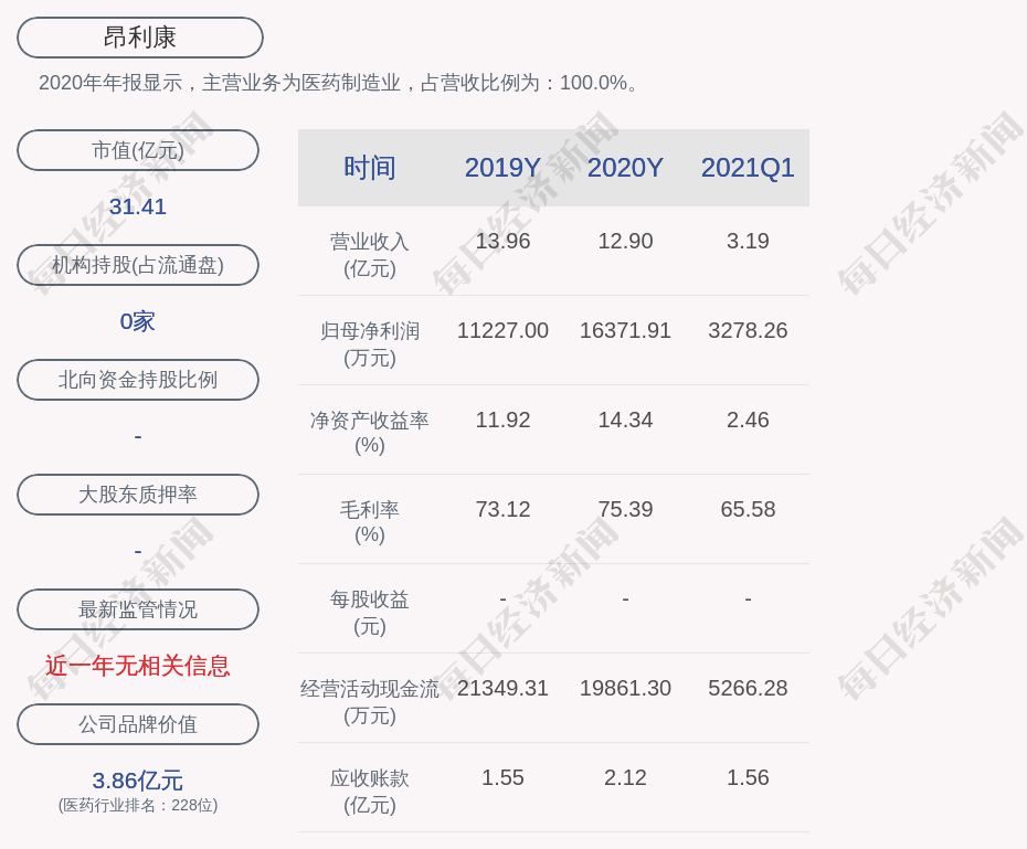 2020年年报显示,昂利康的主营业务为医药制造业,占营收比例为:100.0%。