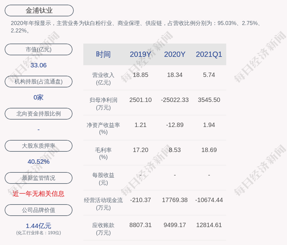 2020年年报显示,金浦钛业的主营业务为钛白粉行业、商业保理、供应链,占营收比例分别为:95.03%、2.75%、2.22%。
