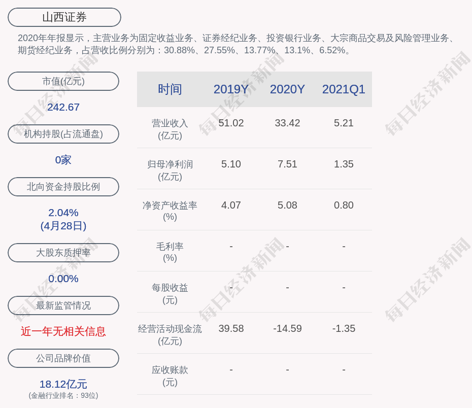 2020年年报显示,山西证券的主营业务为固定收益业务、证券经纪业务、投资银行业务、大宗商品交易及风险管理业务、期货经纪业务,占营收比例分别为:30.88%、27.55%、13.77%、13.1%、6.52%。