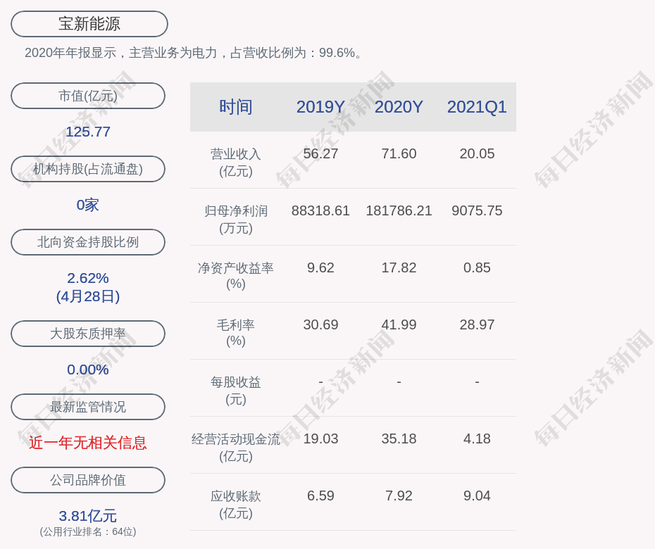 2020年年报显示,宝新能源的主营业务为电力,占营收比例为:99.6%。