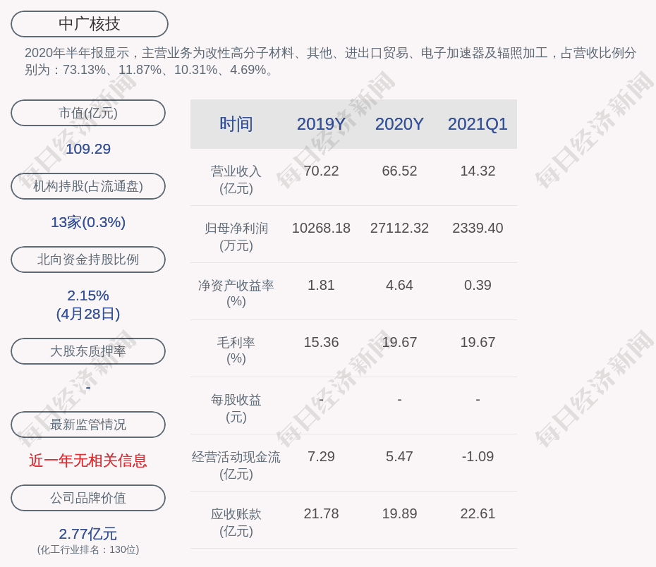 2020年半年报显示,中广核技的主营业务为改性高分子材料、其他、进出口贸易、电子加速器及辐照加工,占营收比例分别为:73.13%、11.87%、10.31%、4.69%。