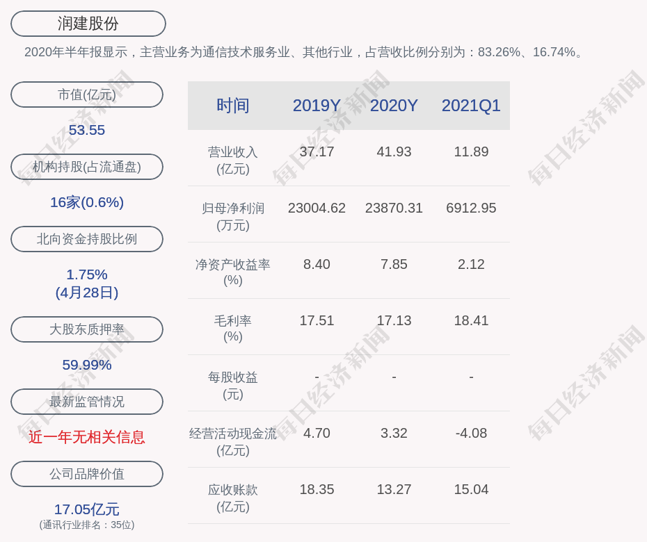 2020年半年报显示,润建股份的主营业务为通信技术服务业、其他行业,占营收比例分别为:83.26%、16.74%。