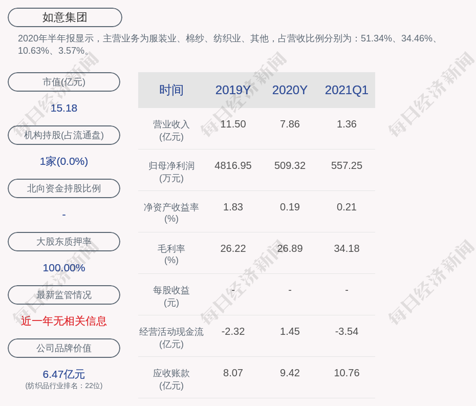 2020年半年报显示,如意集团的主营业务为服装业、棉纱、纺织业、其他,占营收比例分别为:51.34%、34.46%、10.63%、3.57%。