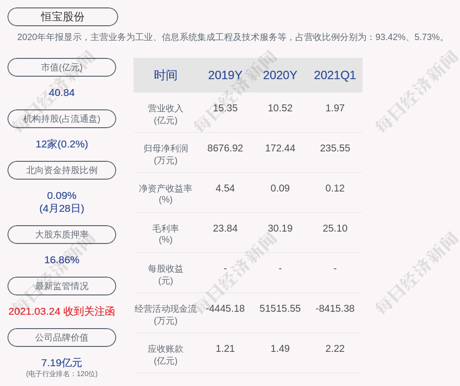 2020年年报显示,恒宝股份的主营业务为工业、信息系统集成工程及技术服务等,占营收比例分别为:93.42%、5.73%。