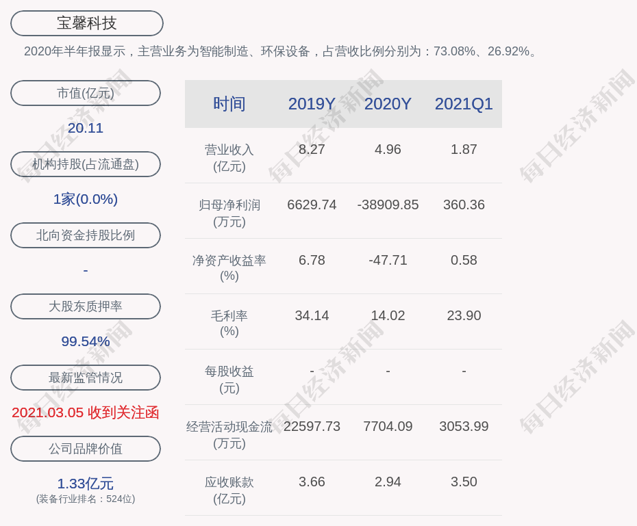 2020年半年报显示,宝馨科技的主营业务为智能制造、环保设备,占营收比例分别为:73.08%、26.92%。