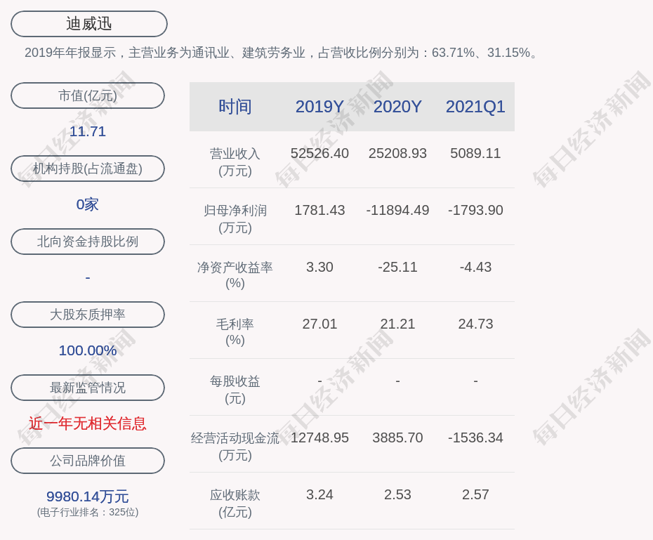 2019年年报显示,迪威迅的主营业务为通讯业、建筑劳务业,占营收比例分别为:63.71%、31.15%。