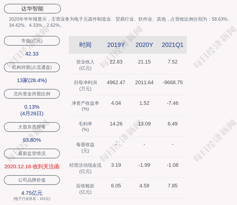 2020年半年报显示,达华智能的主营业务为电子元器件制造业、贸易行业、软件业、其他,占营收比例分别为:58.63%、34.42%、4.33%、2.62%。