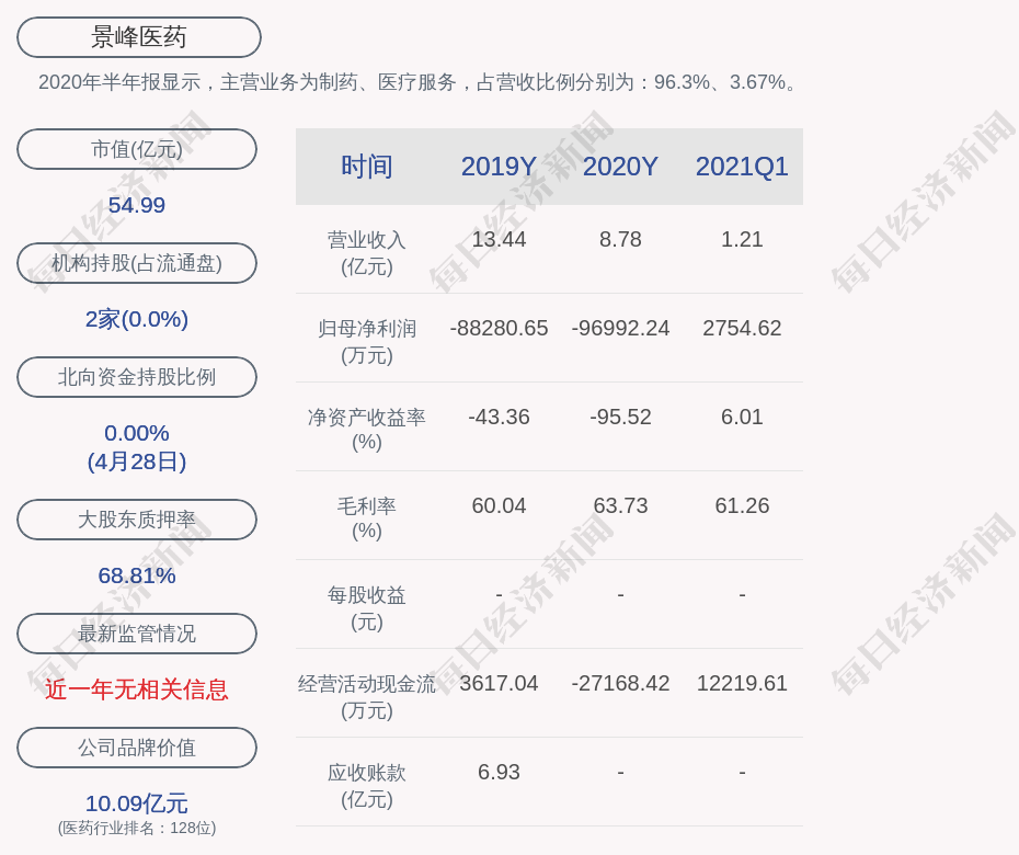 2020年半年报显示,景峰医药的主营业务为制药、医疗服务,占营收比例分别为:96.3%、3.67%。