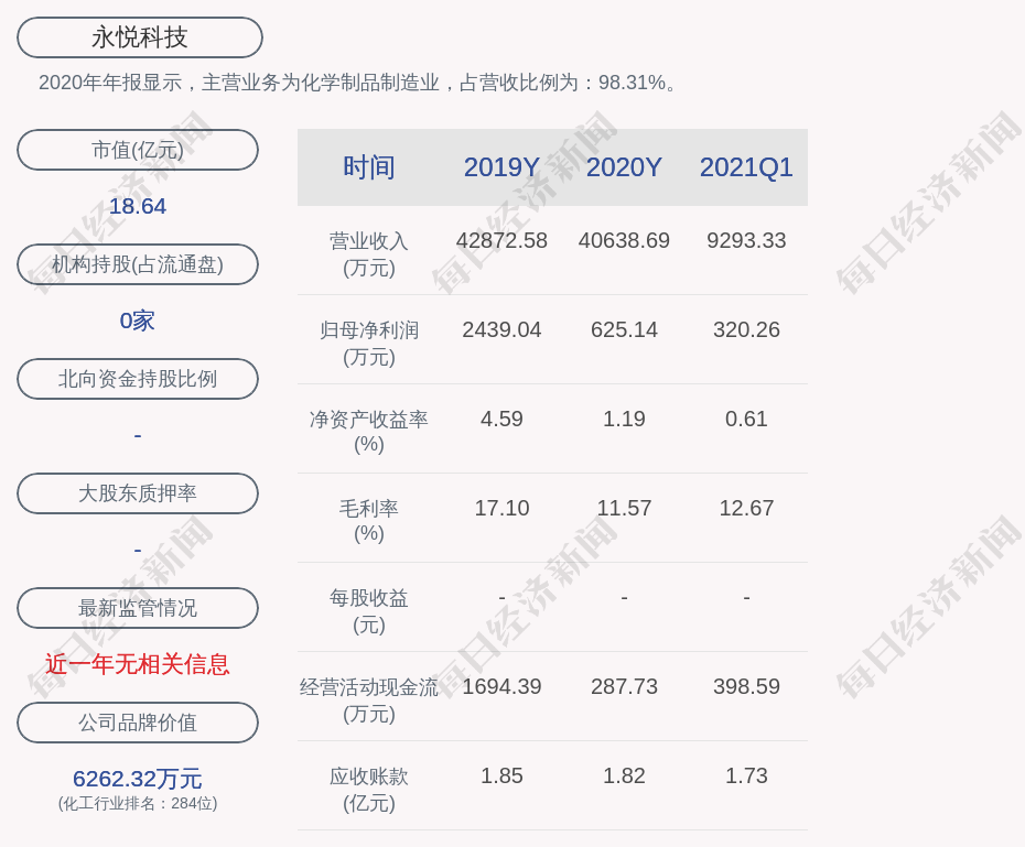2020年年报显示,永悦科技的主营业务为化学制品制造业,占营收比例为:98.31%。