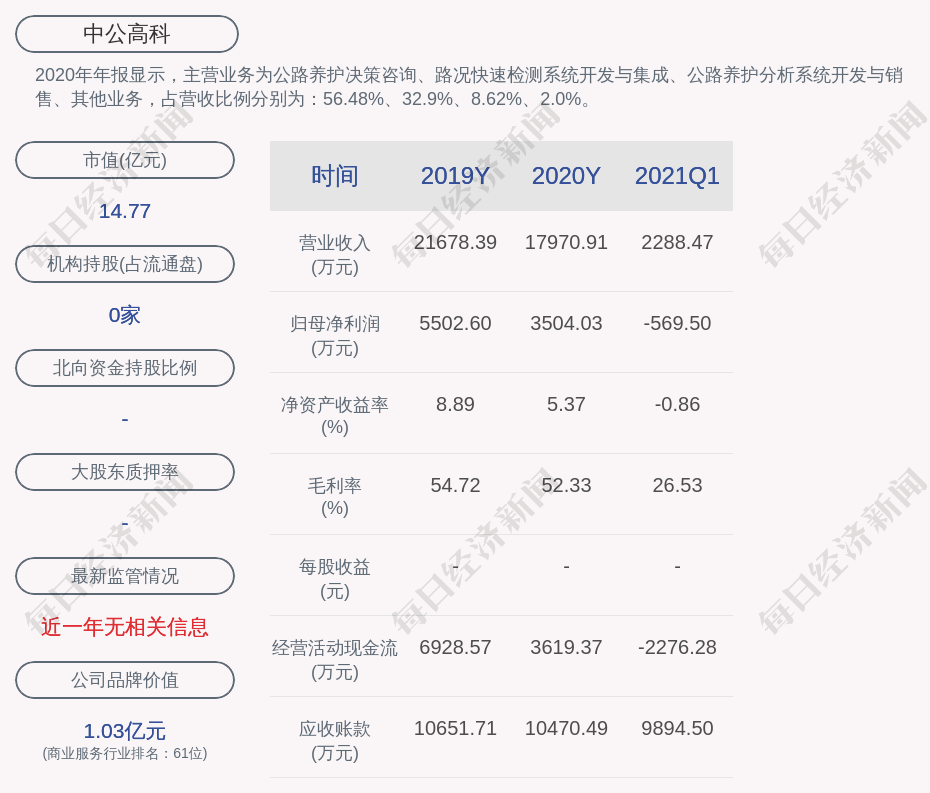 2020年年报显示,中公高科的主营业务为公路养护决策咨询、路况快速检测系统开发与集成、公路养护分析系统开发与销售、其他业务,占营收比例分别为:56.48%、32.9%、8.62%、2.0%。