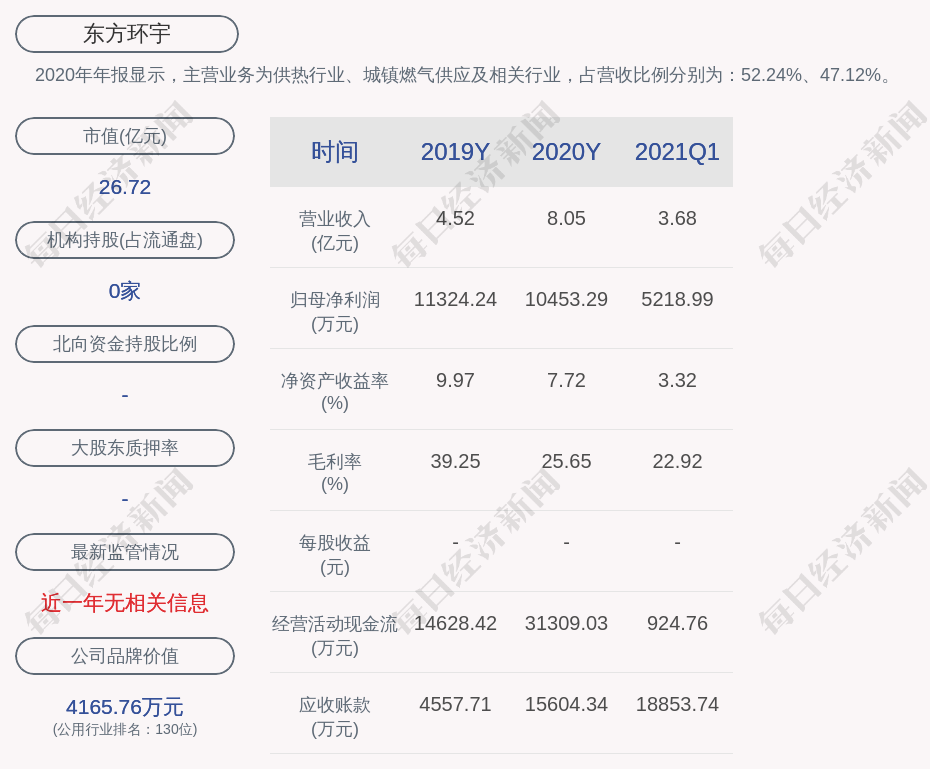 2020年年报显示,东方环宇的主营业务为供热行业、城镇燃气供应及相关行业,占营收比例分别为:52.24%、47.12%。