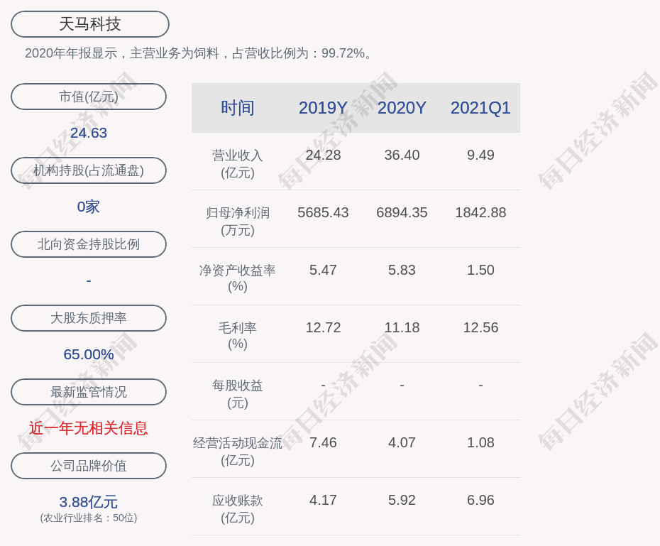 2020年年报显示,天马科技的主营业务为饲料,占营收比例为:99.72%。