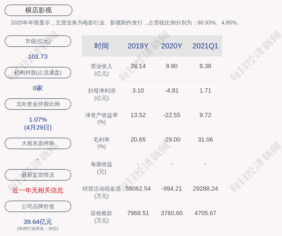 2020年年报显示,横店影视的主营业务为电影行业、影视制作发行,占营收比例分别为:90.93%、4.85%。