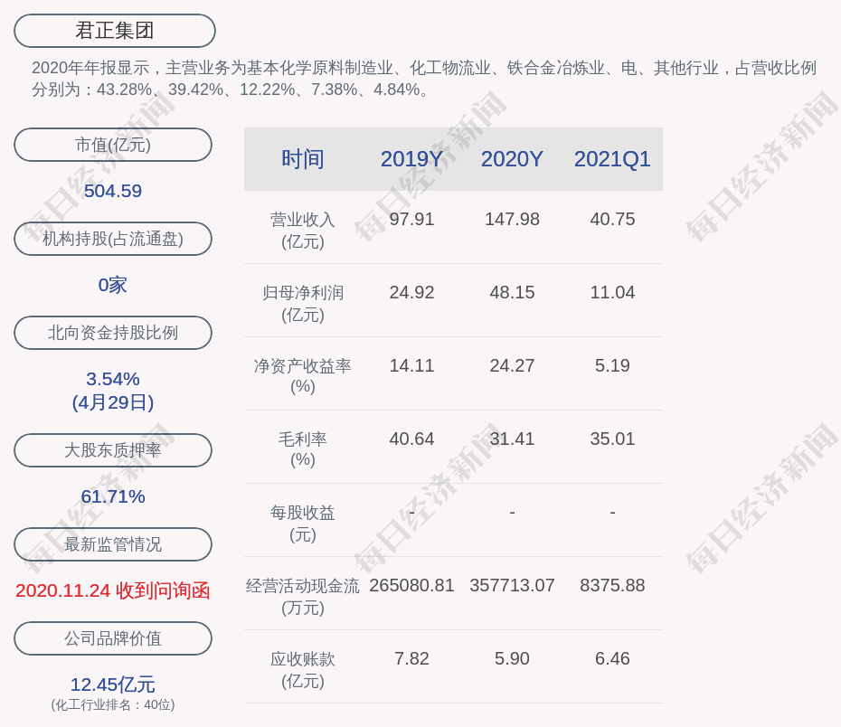 2020年年报显示,君正集团的主营业务为基本化学原料制造业、化工物流业、铁合金冶炼业、电、其他行业,占营收比例分别为:43.28%、39.42%、12.22%、7.38%、4.84%。