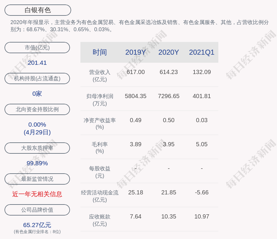 2020年年报显示,白银有色的主营业务为有色金属贸易、有色金属采选冶炼及销售、有色金属服务、其他,占营收比例分别为:68.67%、30.31%、0.65%、0.03%。