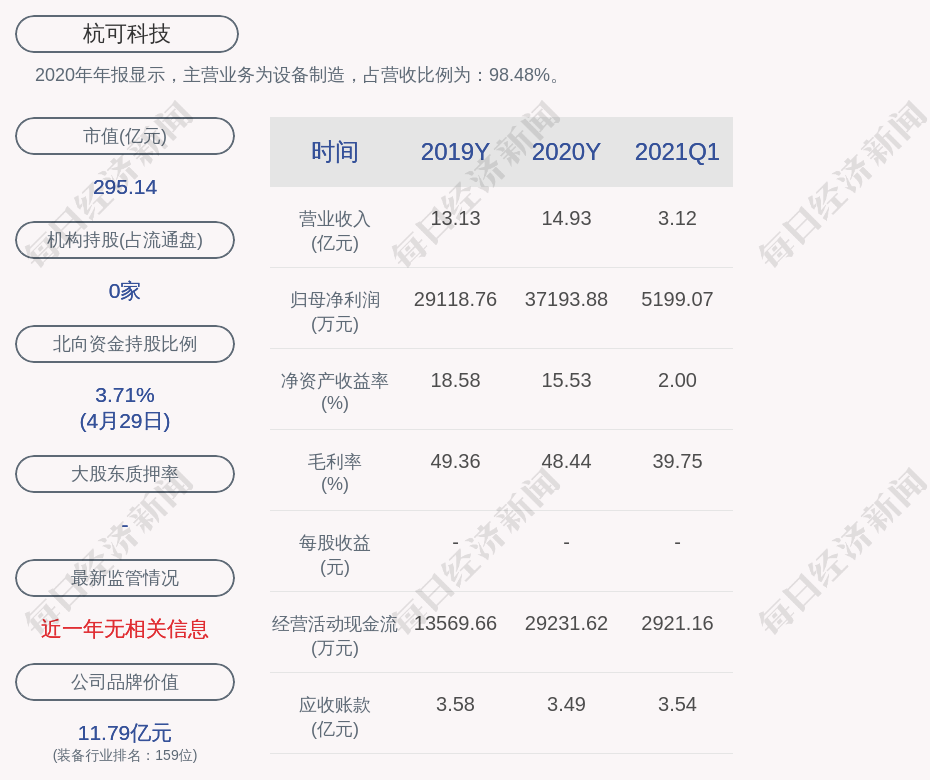 2020年年报显示,杭可科技的主营业务为设备制造,占营收比例为:98.48%。
