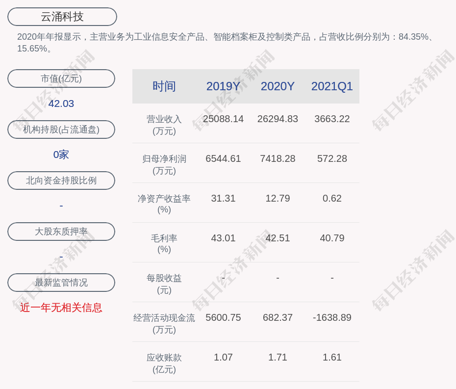 2020年年报显示,云涌科技的主营业务为工业信息安全产品、智能档案柜及控制类产品,占营收比例分别为:84.35%、15.65%。