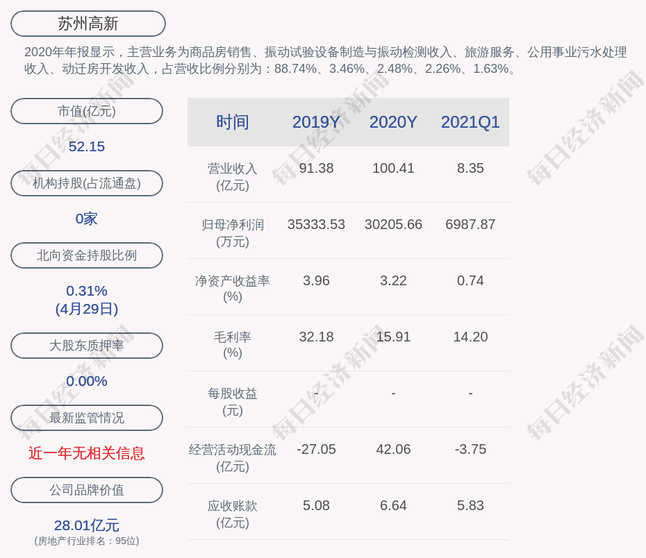 2020年年报显示,苏州高新的主营业务为商品房销售、振动试验设备制造与振动检测收入、旅游服务、公用事业污水处理收入、动迁房开发收入,占营收比例分别为:88.74%、3.46%、2.48%、2.26%、1.63%。