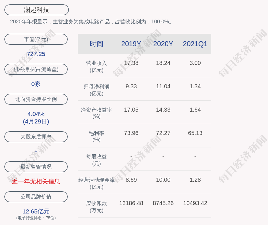 2020年年报显示,澜起科技的主营业务为集成电路产品,占营收比例为:100.0%。