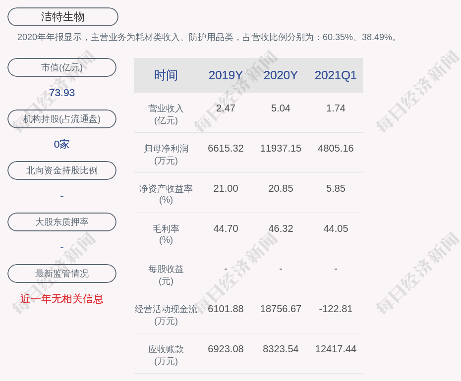 2020年年报显示,洁特生物的主营业务为耗材类收入、防护用品类,占营收比例分别为:60.35%、38.49%。