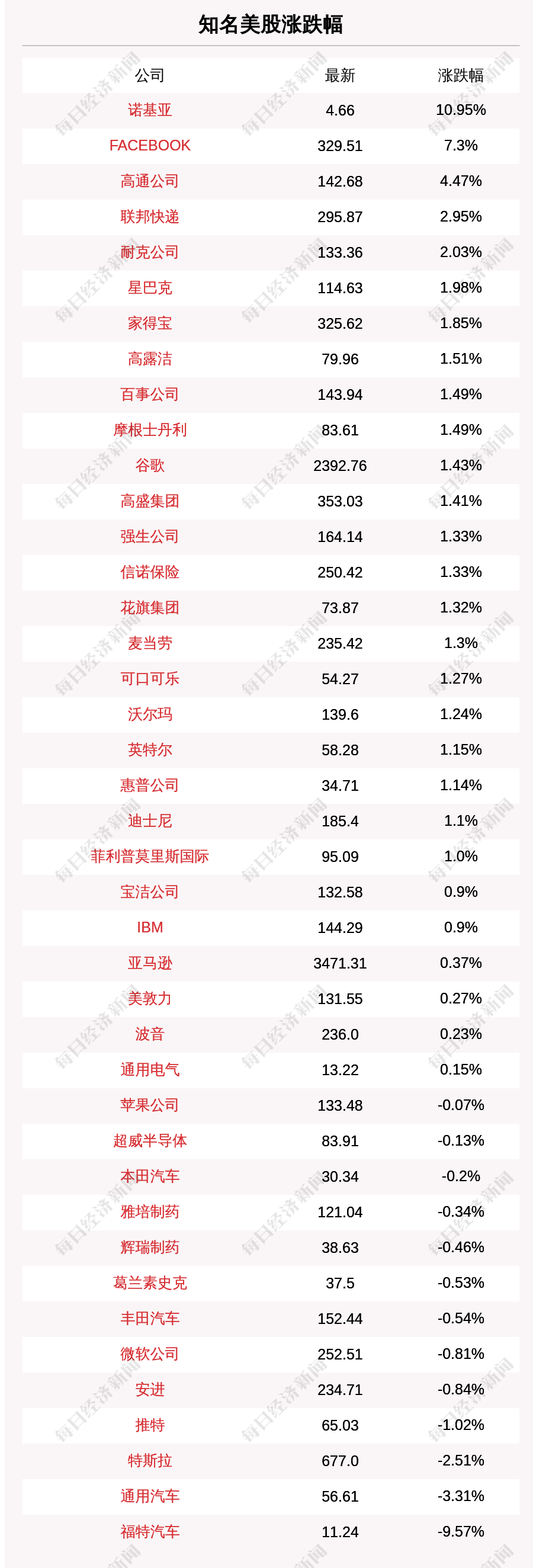 每经AI快讯:北京时间4月30日05:30,知名美股中诺基亚、FACEBOOK、高通公司、联邦快递、耐克公司涨幅居前,收盘分别上涨10.95%、7.3%、4.47%、2.95%、2.03%。福特汽车、通用汽车、特斯拉、推特、安进跌幅居前,收盘分别下跌9.57%、3.31%、2.51%、1.02%、0.84%。