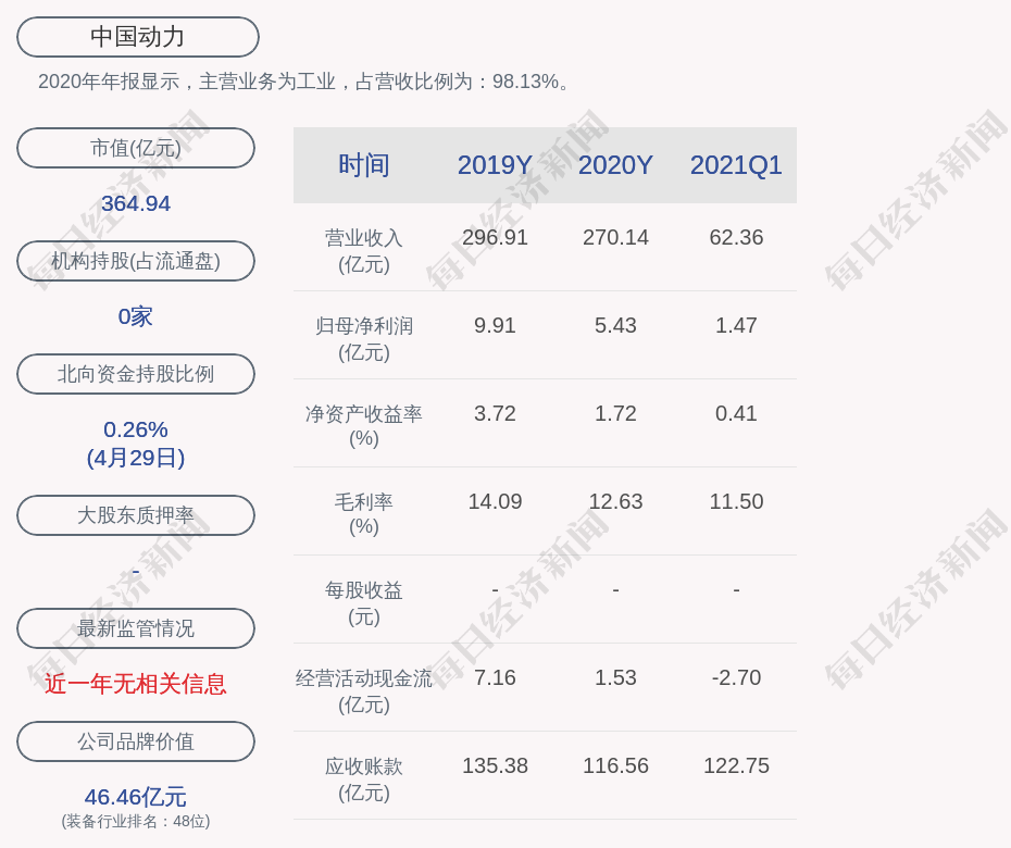 2020年年报显示,中国动力的主营业务为工业,占营收比例为:98.13%。