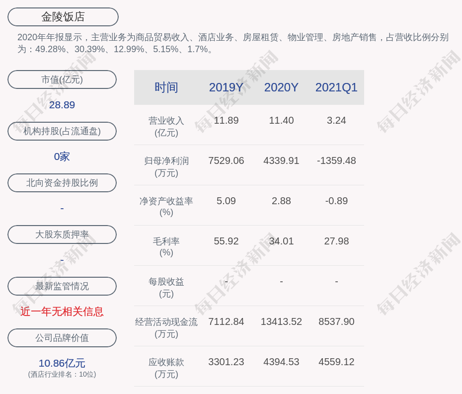 2020年年报显示,金陵饭店的主营业务为商品贸易收入、酒店业务、房屋租赁、物业管理、房地产销售,占营收比例分别为:49.28%、30.39%、12.99%、5.15%、1.7%。