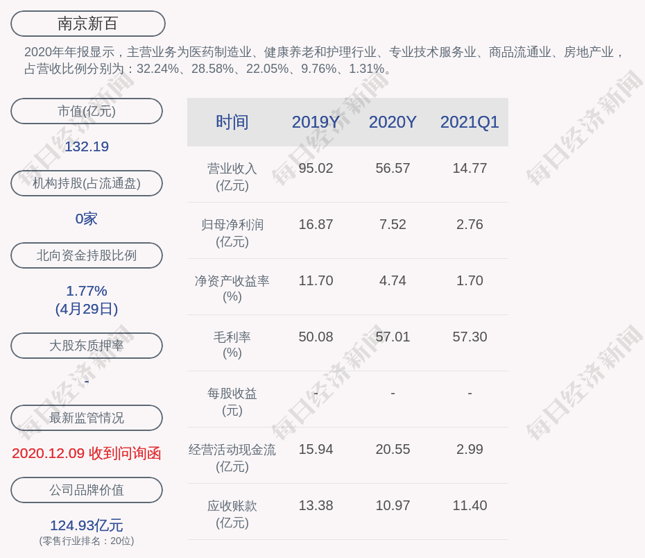 2020年年报显示,南京新百的主营业务为医药制造业、健康养老和护理行业、专业技术服务业、商品流通业、房地产业,占营收比例分别为:32.24%、28.58%、22.05%、9.76%、1.31%。