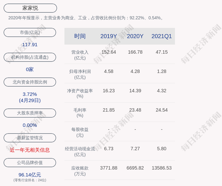 2020年年报显示,家家悦的主营业务为商业、工业,占营收比例分别为:92.22%、0.54%。
