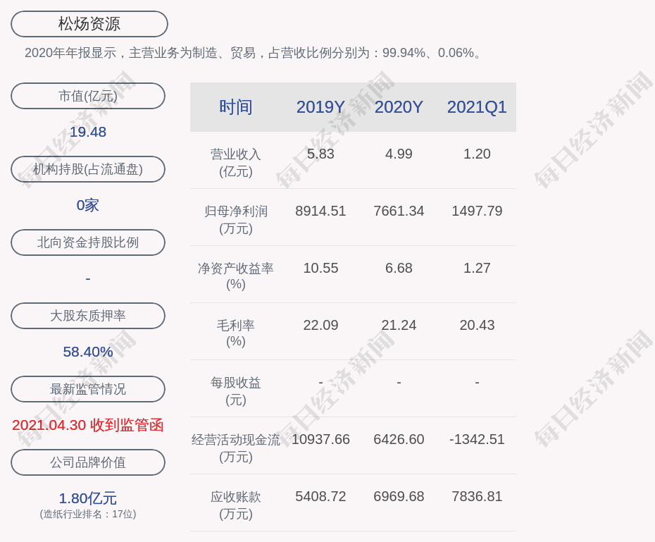 2020年年报显示,松炀资源的主营业务为制造、贸易,占营收比例分别为:99.94%、0.06%。