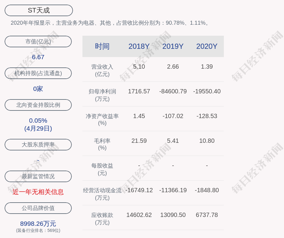 2020年年报显示,ST天成的主营业务为电器、其他,占营收比例分别为:90.78%、1.11%。