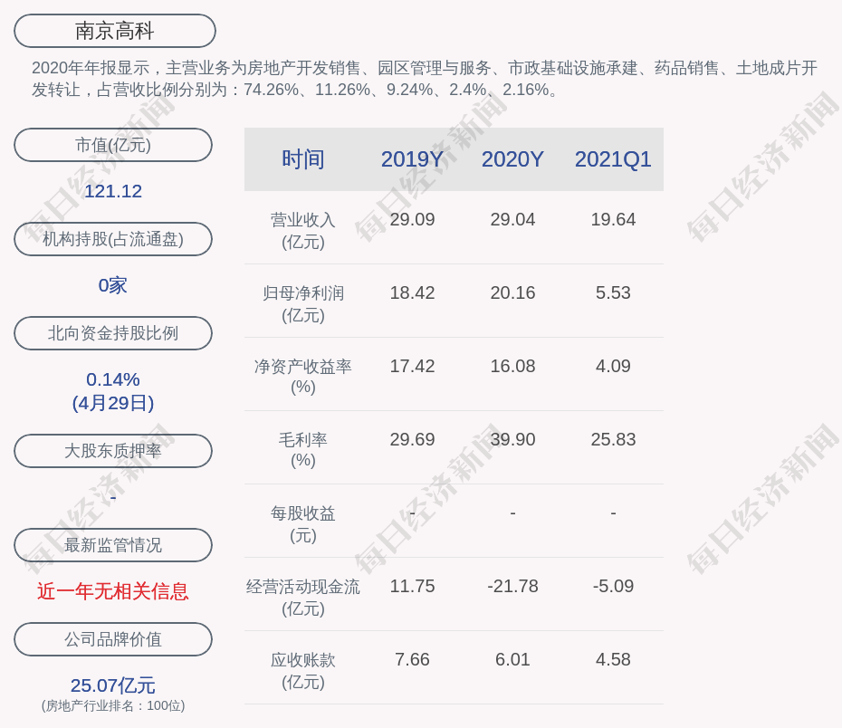 2020年年报显示,南京高科的主营业务为房地产开发销售、园区管理与服务、市政基础设施承建、药品销售、土地成片开发转让,占营收比例分别为:74.26%、11.26%、9.24%、2.4%、2.16%。