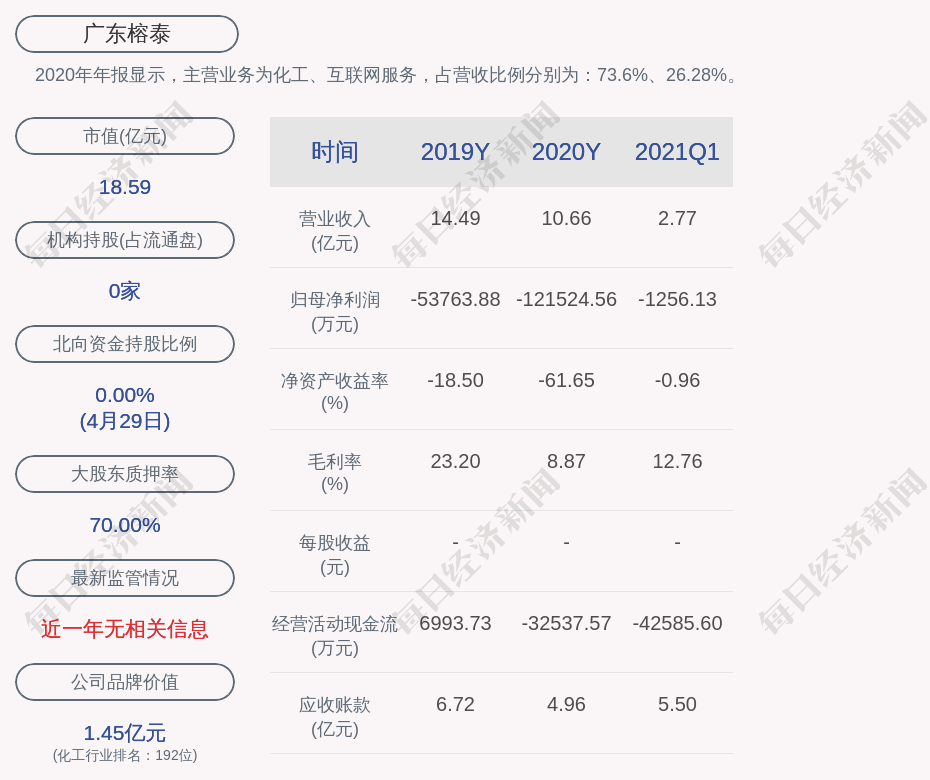 2020年年报显示,广东榕泰的主营业务为化工、互联网服务,占营收比例分别为:73.6%、26.28%。