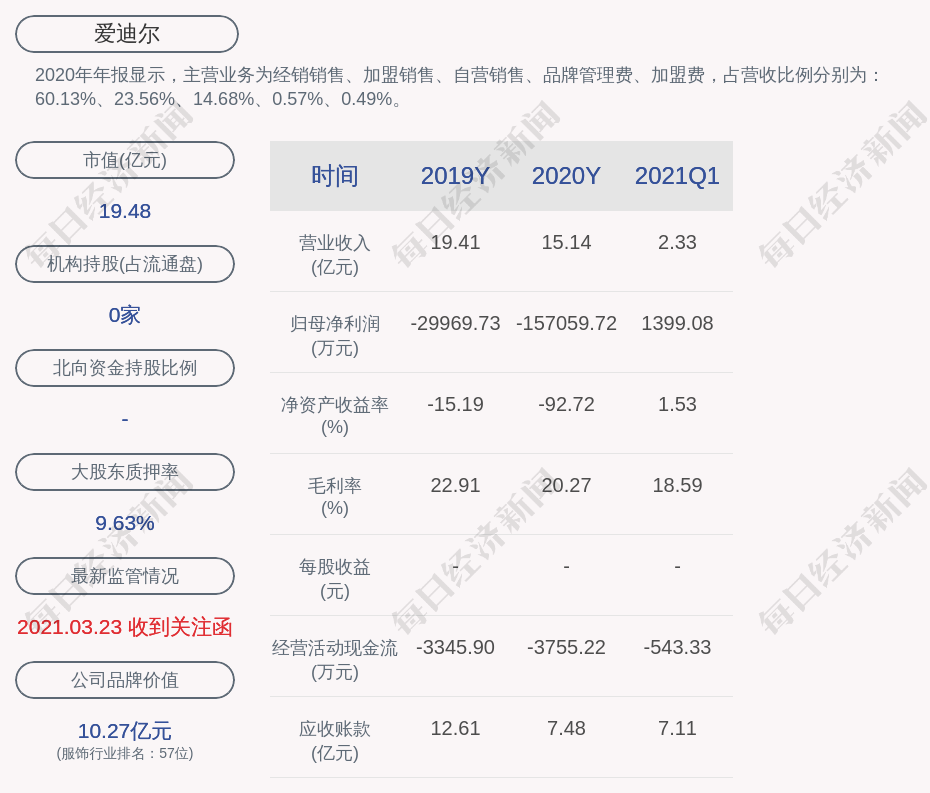 2020年年报显示,爱迪尔的主营业务为经销销售、加盟销售、自营销售、品牌管理费、加盟费,占营收比例分别为:60.13%、23.56%、14.68%、0.57%、0.49%。