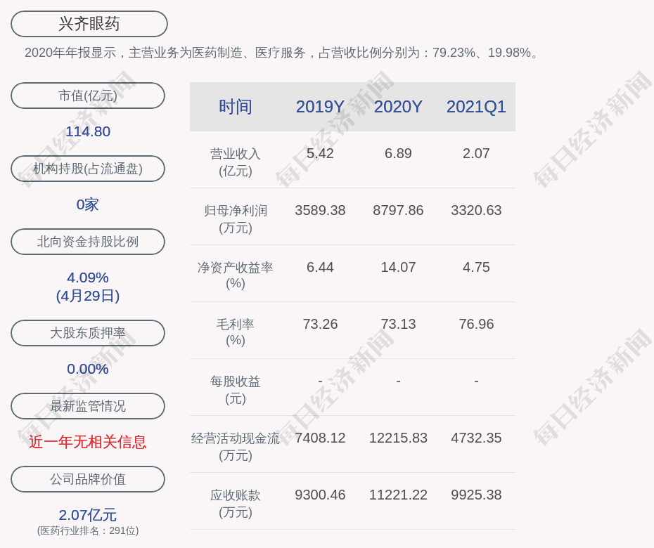 2020年年报显示,兴齐眼药的主营业务为医药制造、医疗服务,占营收比例分别为:79.23%、19.98%。