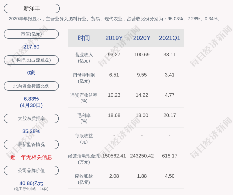 2020年年报显示,新洋丰的主营业务为肥料行业、贸易、现代农业,占营收比例分别为:95.03%、2.28%、0.34%。