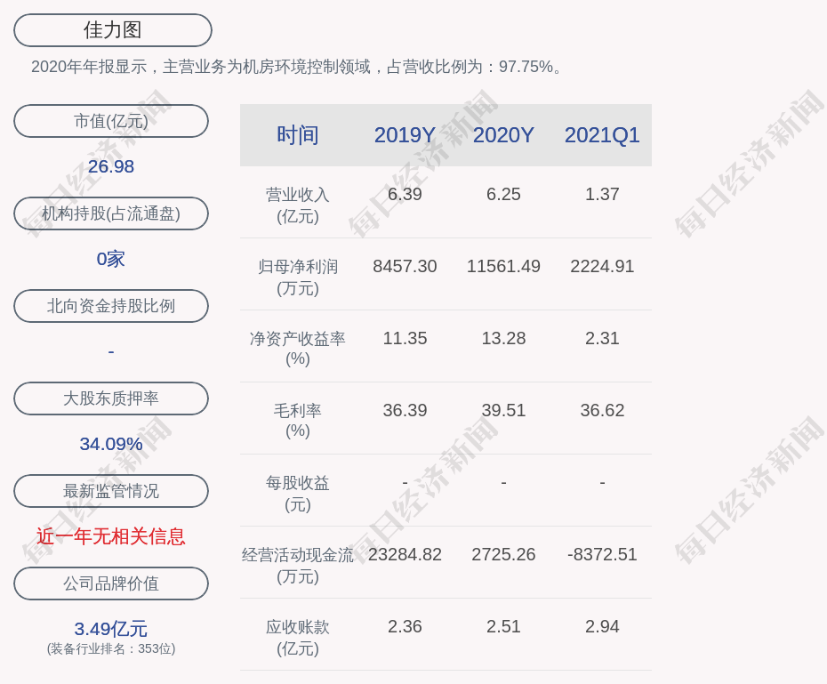 2020年年报显示,佳力图的主营业务为机房环境控制领域,占营收比例为:97.75%。