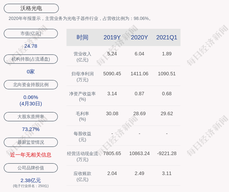 2020年年报显示,沃格光电的主营业务为光电子器件行业,占营收比例为:98.06%。