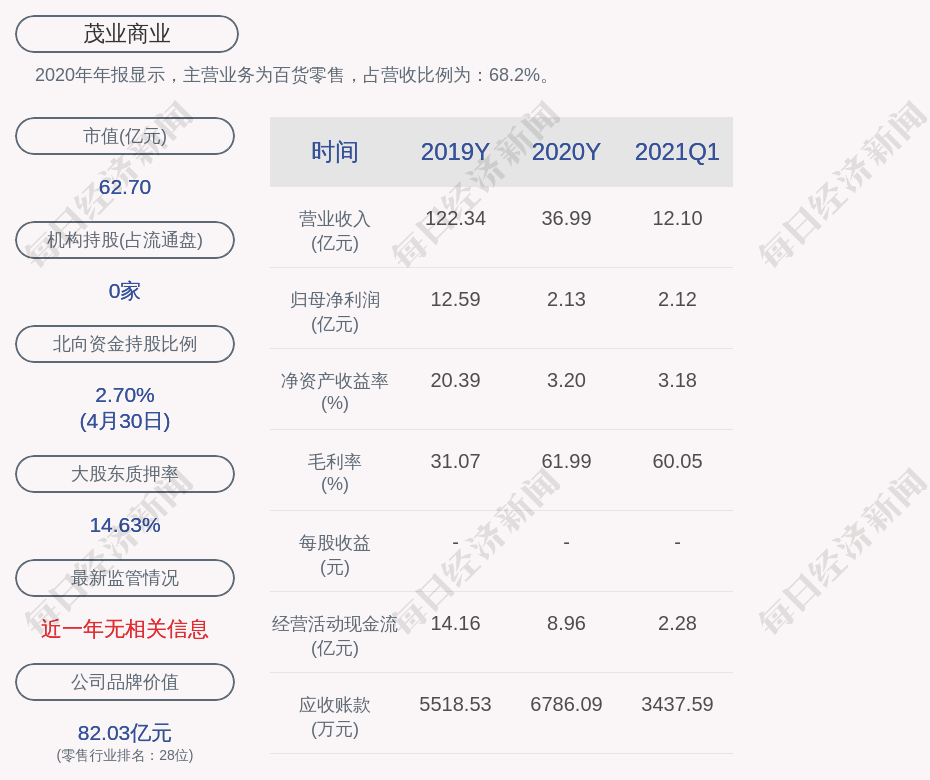 2020年年报显示,茂业商业的主营业务为百货零售,占营收比例为:68.2%。