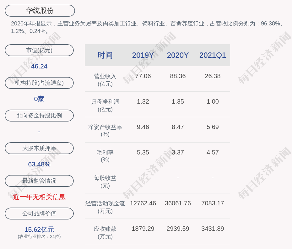 2020年年报显示,华统股份的主营业务为屠宰及肉类加工行业、饲料行业、畜禽养殖行业,占营收比例分别为:96.38%、1.2%、0.24%。