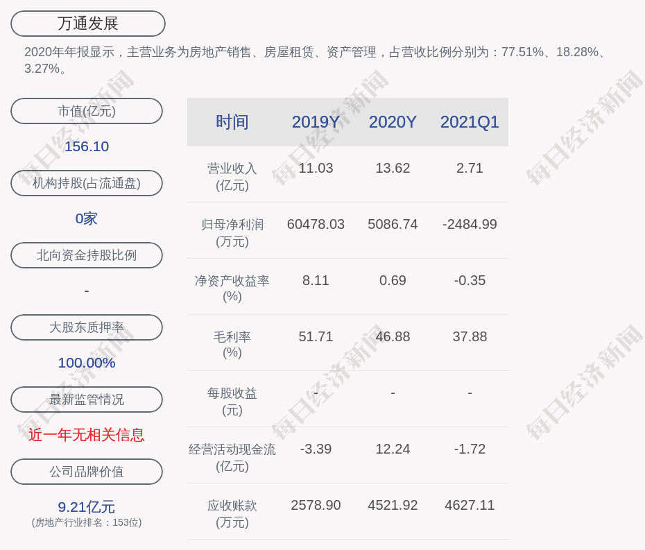 2020年年报显示,万通发展的主营业务为房地产销售、房屋租赁、资产管理,占营收比例分别为:77.51%、18.28%、3.27%。