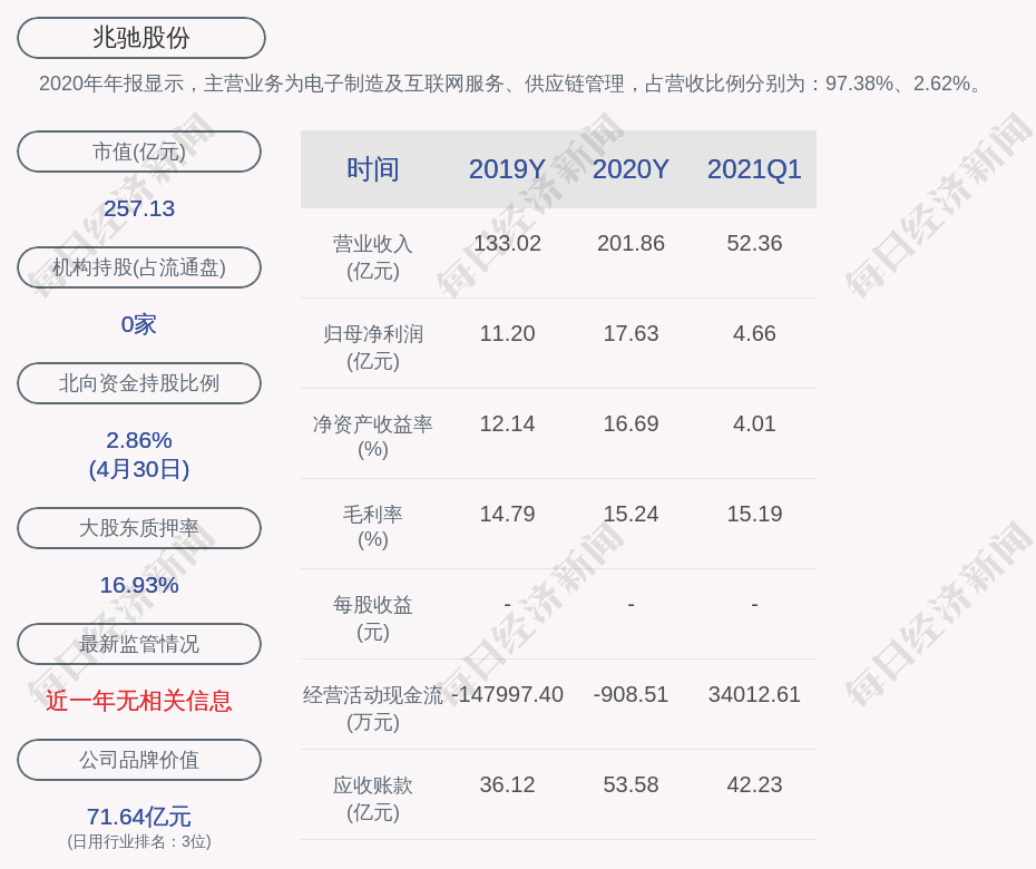 2020年年报显示,兆驰股份的主营业务为电子制造及互联网服务、供应链管理,占营收比例分别为:97.38%、2.62%。