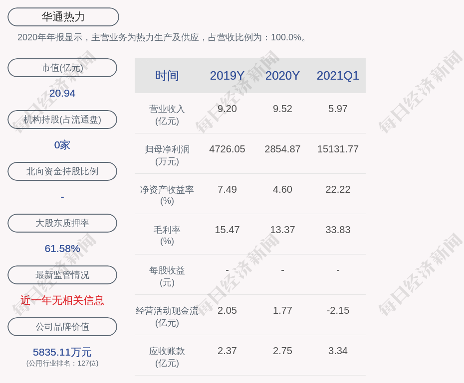 2020年年报显示,华通热力的主营业务为热力生产及供应,占营收比例为:100.0%。
