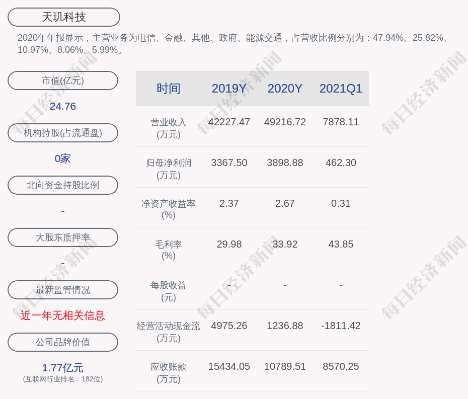 2020年年报显示,天玑科技的主营业务为电信、金融、其他、政府、能源交通,占营收比例分别为:47.94%、25.82%、10.97%、8.06%、5.99%。